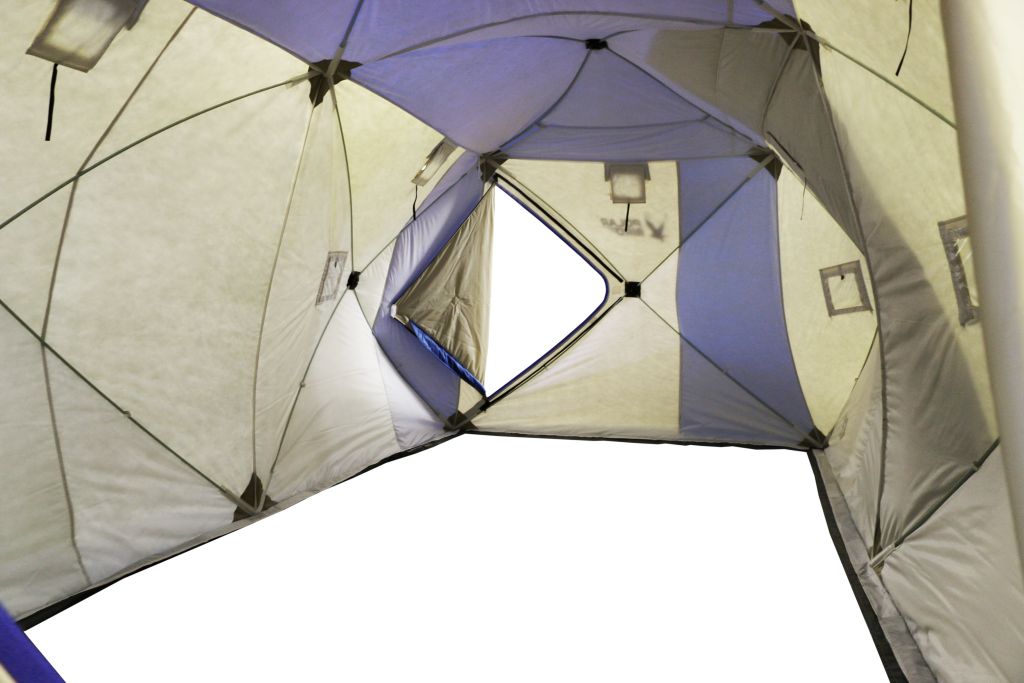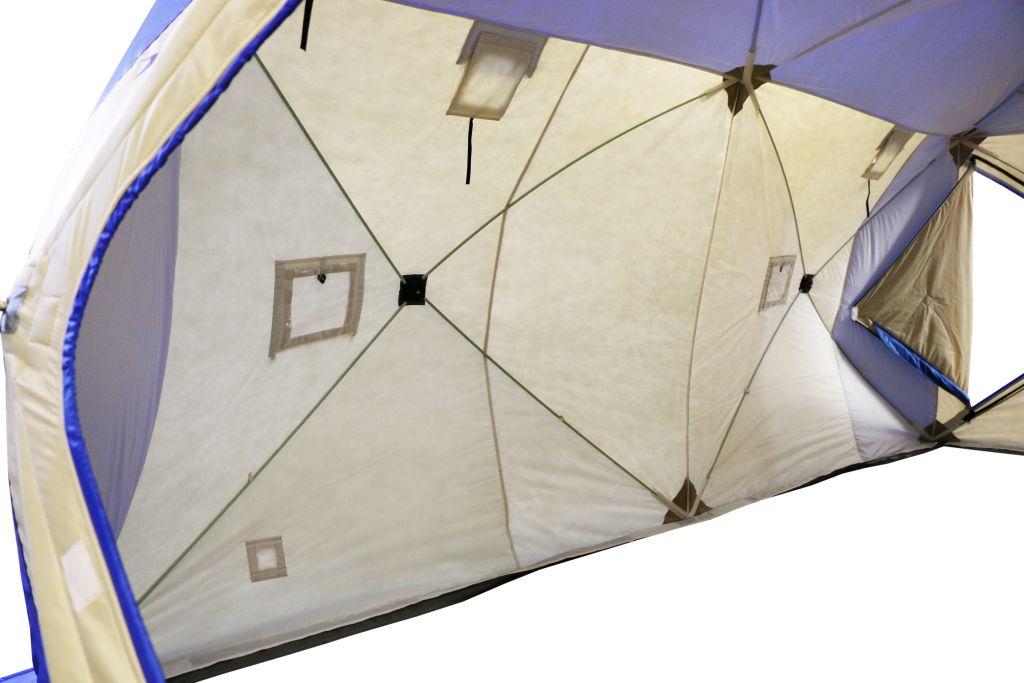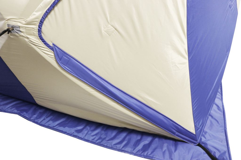 Внешний слой тента выполнен из прочной ткани оксфорд бежевого и синего цвета, ткань хорошо пропускает свет, легко чистится с нее легко соскальзывает снег, внутренний слой белого цвета, что делает палатку еще более светлой, позволяя рыбачить без дополнительного освещения в светлое время суток.