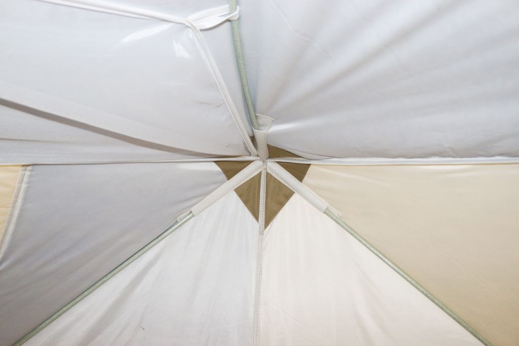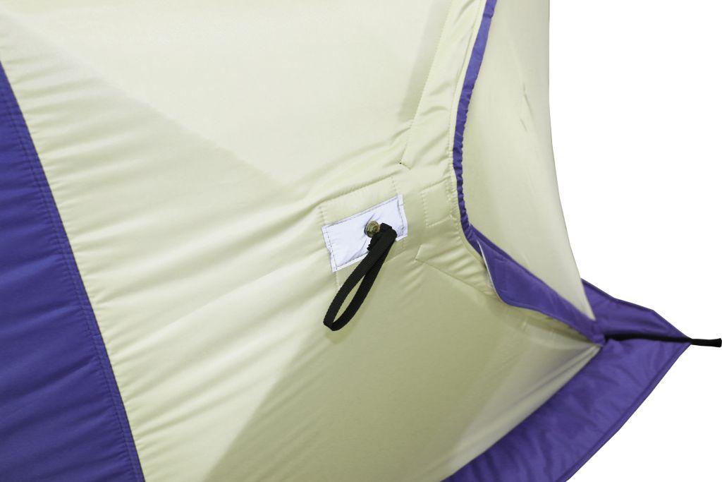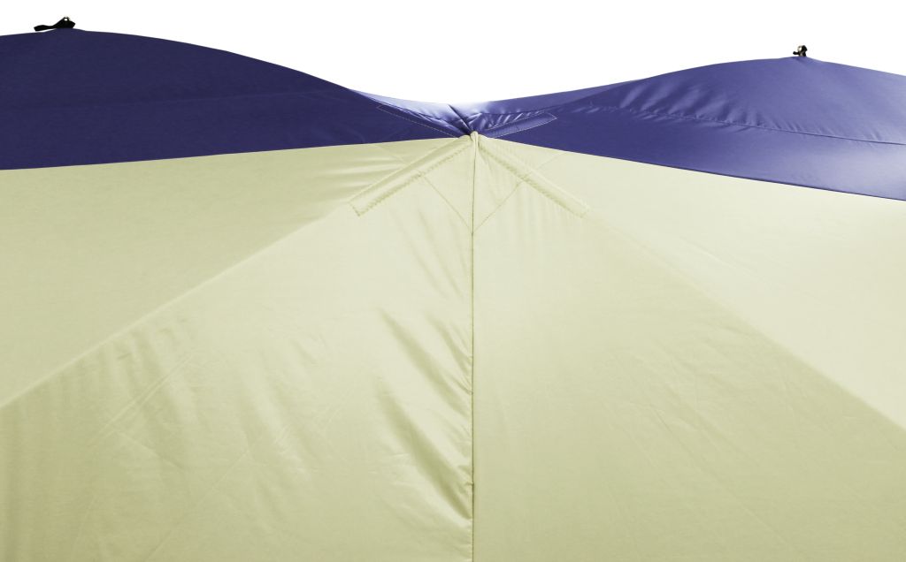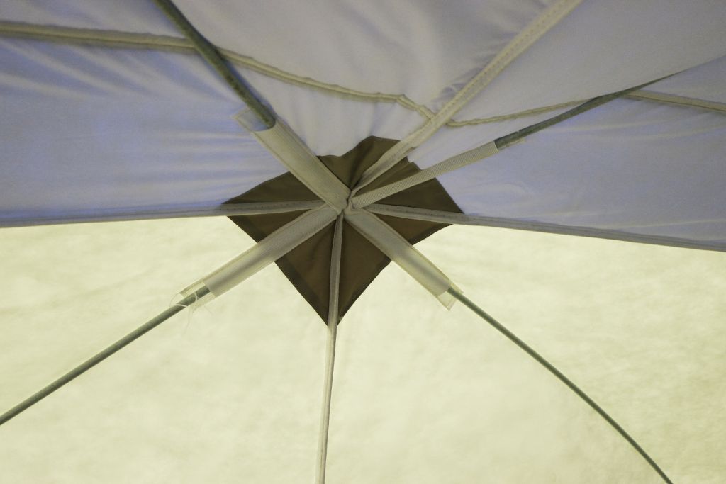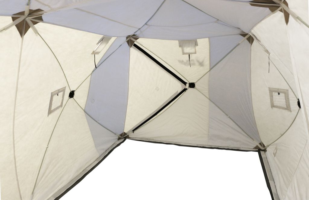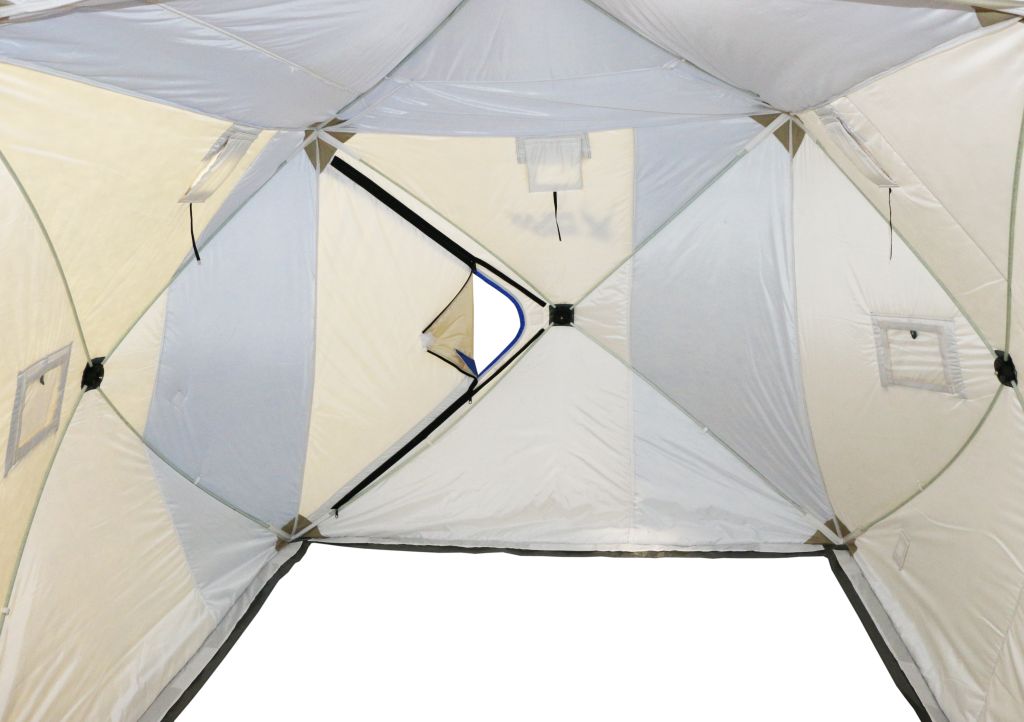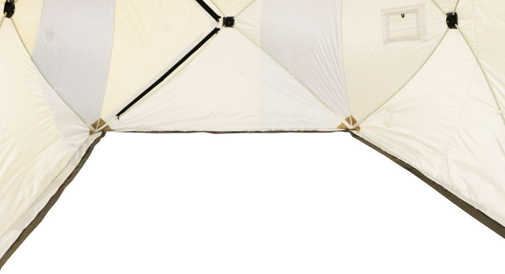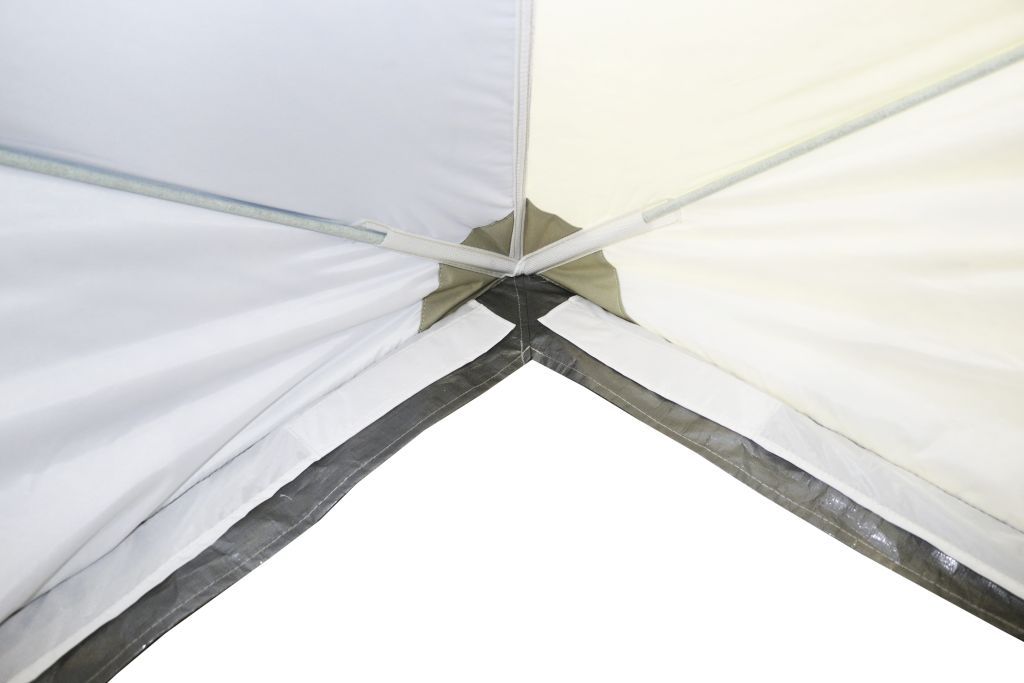 Тент изготавливается по специальной технологии, без использования термостежки, поэтому в нем отсутствуют мостики холода, а утеплитель остается пышным максимально эффективно сохраняя тепло в палатке.