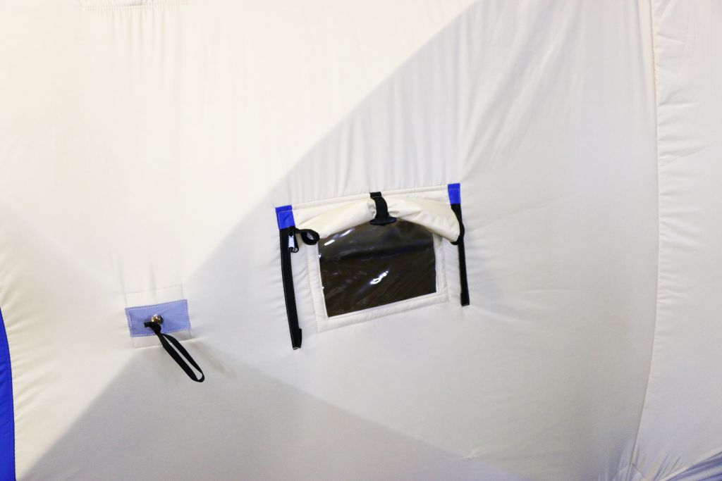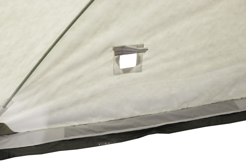 Вентиляционные она используются для проветривания палатки и вывода газоотводных труб отопителей. Трубу отопителя можно вывести в любое удобное для вас вентиляционное окно, снаружи окна имеют козырьки обшитые термостойкой тканью, изнутри клапана вентиляционных окон имеют специальные привязки, чтобы когда он открыт не касался трубы отопителя. Вентиляционные окна оснащаются съемными прозрачными накладками из морозостойкой пленки с креплением на "липучку", с помощью которых можно регулировать вентиляцию. Их также можно дополнительно заменить на термостойкие накладки под трубы различных отопителей или на накладки из москитной сетки, в случае использования палатки в теплое время года. Дополнительно палатки "Polar bird" оснащены смотровыми окнами, которые также можно укомплектовать москитными сетками.