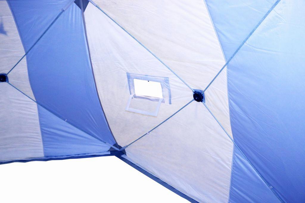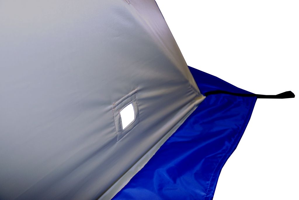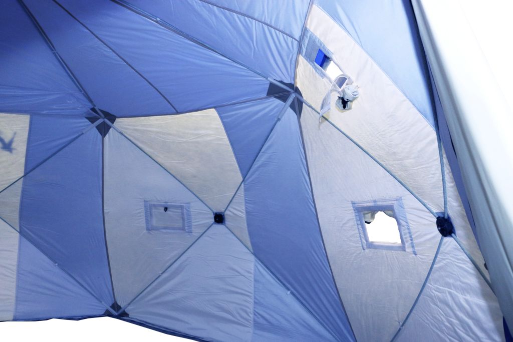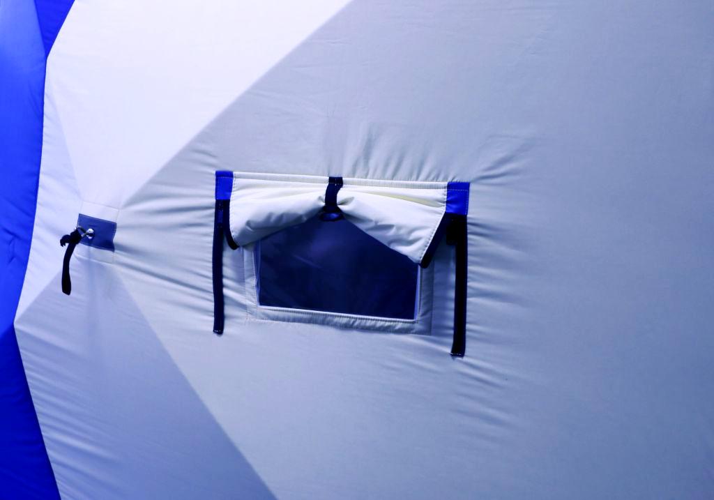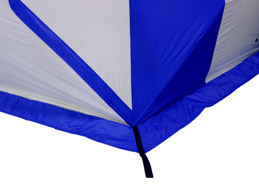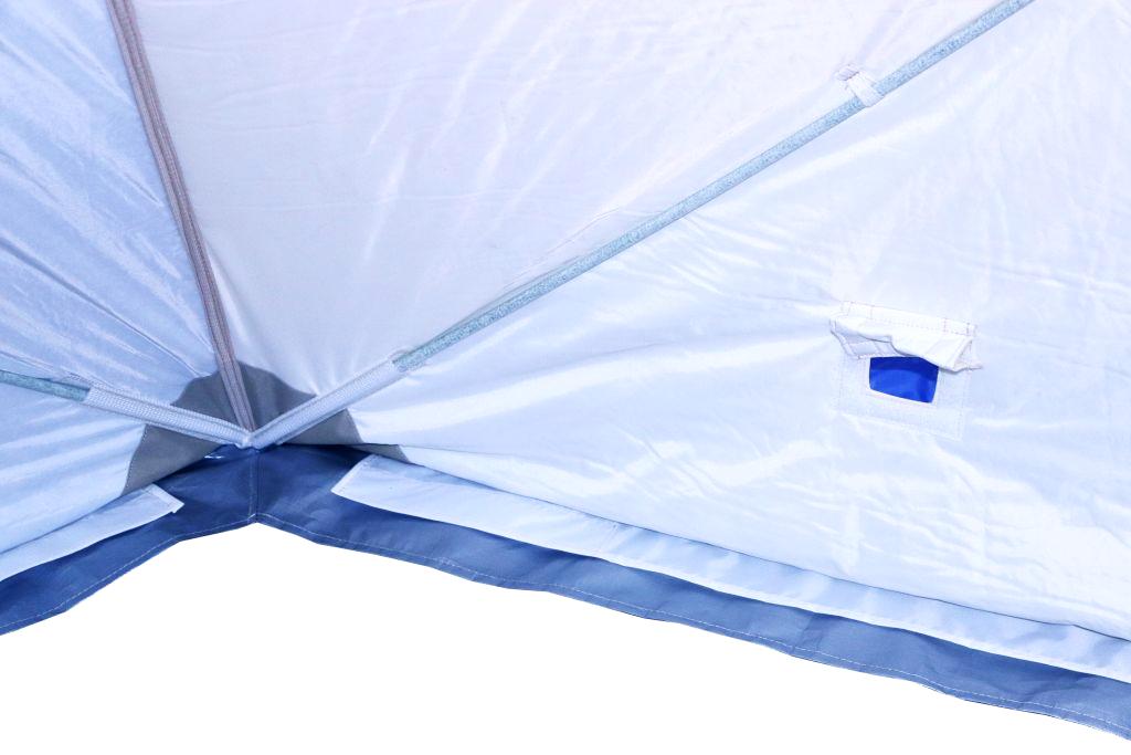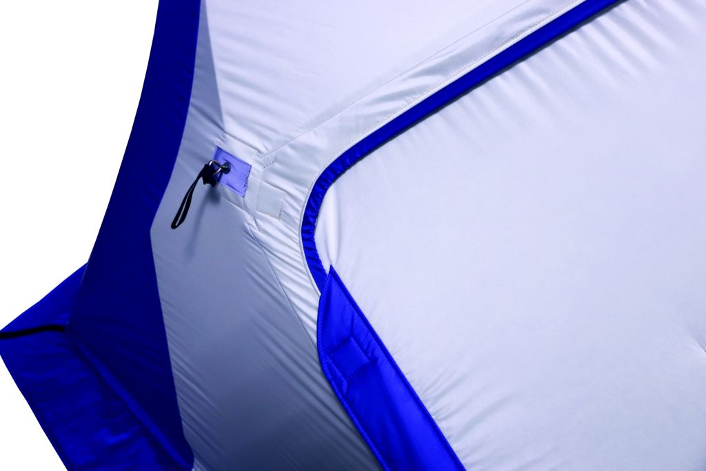 Внешний слой тента выполнен из прочной ткани оксфорд серого и синего цвета, ткань хорошо пропускает свет, легко чистится с нее легко соскальзывает снег, внутренний слой белого цвета, что делает палатку еще более светлой, позволяя рыбачить без дополнительного освещения в светлое время суток.