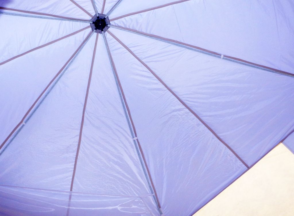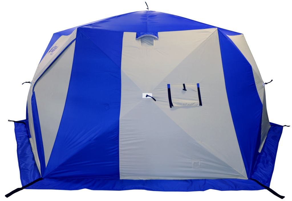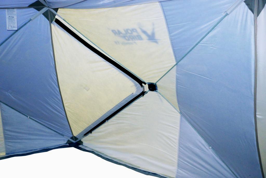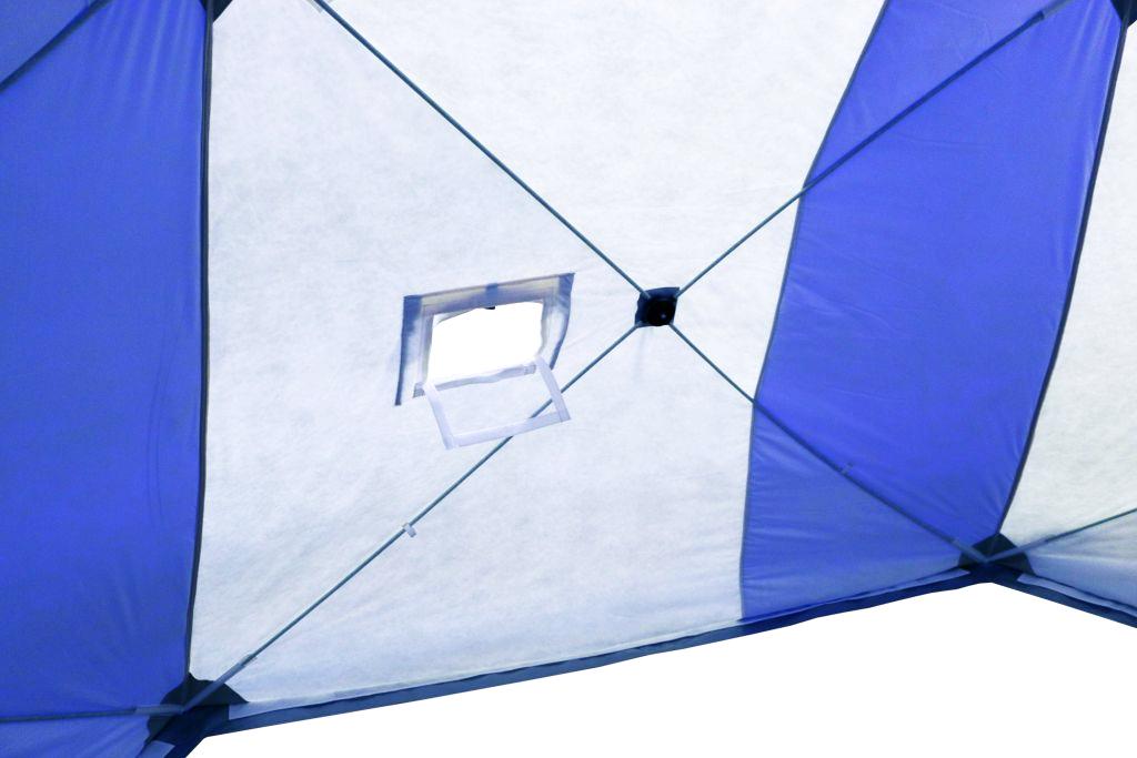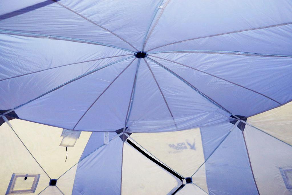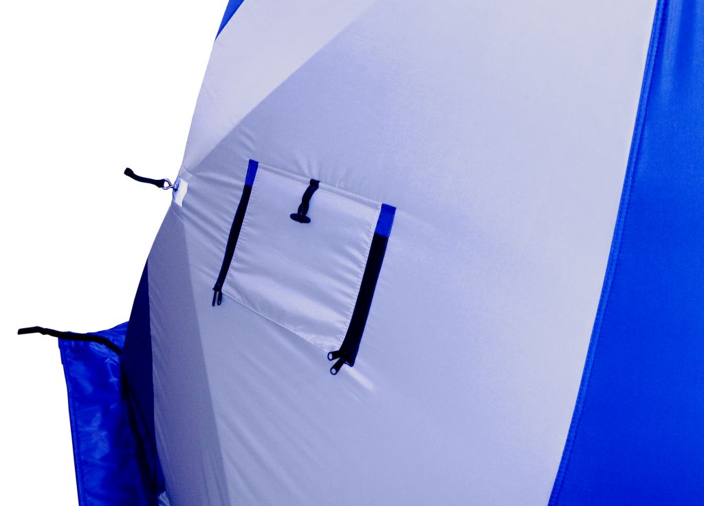 Внешний слой тента выполнен из прочной ткани оксфорд серого и синего цвета, ткань хорошо пропускает свет, легко чистится с нее легко соскальзывает снег, внутренний слой белого цвета, что делает палатку еще более светлой, позволяя рыбачить без дополнительного освещения в светлое время суток.
