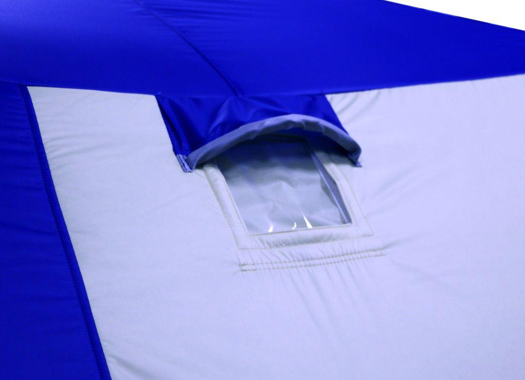 Вентиляционные она используются для проветривания палатки и вывода газоотводных труб отопителей. Трубу отопителя можно вывести в любое удобное для вас вентиляционное окно, снаружи окна имеют козырьки обшитые термостойкой тканью, изнутри клапана вентиляционных окон имеют специальные привязки, чтобы когда он открыт не касался трубы отопителя. Вентиляционные и смотровые окна оснащаются съемными прозрачными накладками из морозостойкой пленки с креплением на "липучку", с помощью которых можно регулировать вентиляцию. Их также можно дополнительно заменить на термостойкие накладки под трубы различных отопителей или на накладки из москитной сетки, в случае использования палатки в теплое время года.
