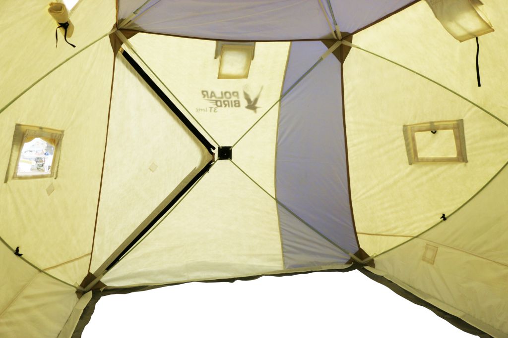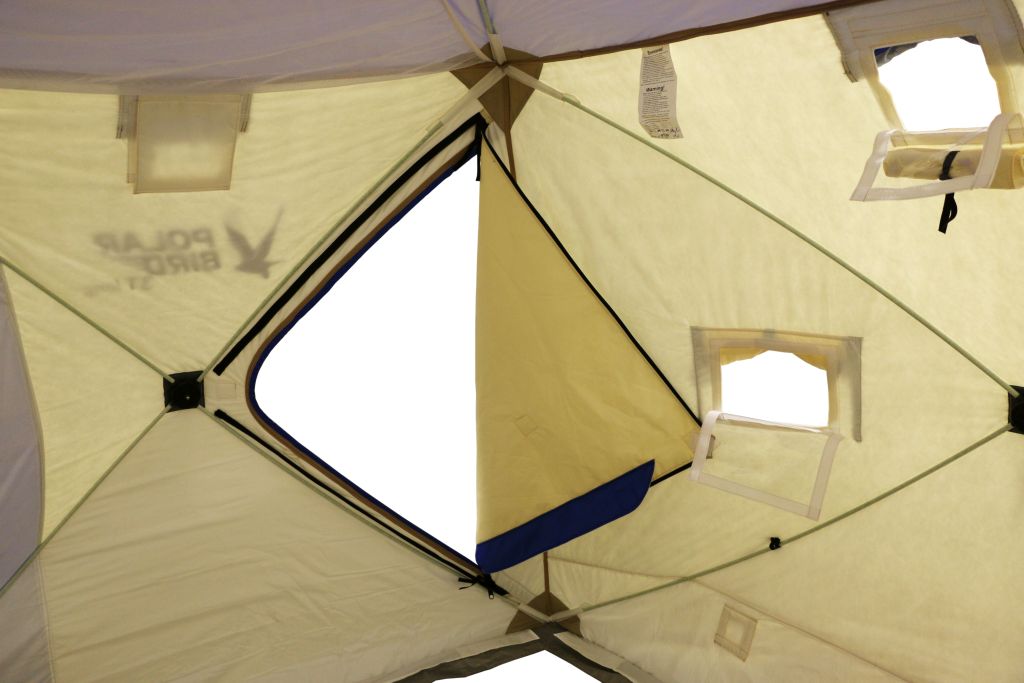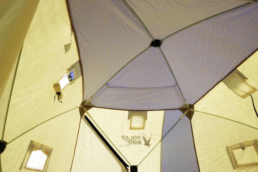 Светлая ткань внутри палатки создает комфортные условия для рыбалки, теперь можно обойтись минимальным освещением. |