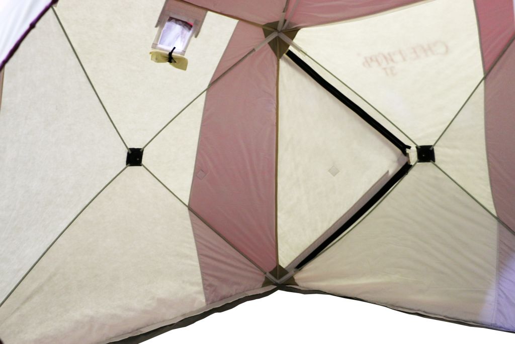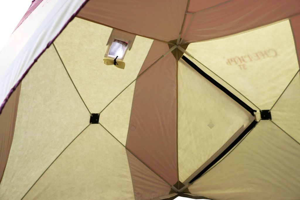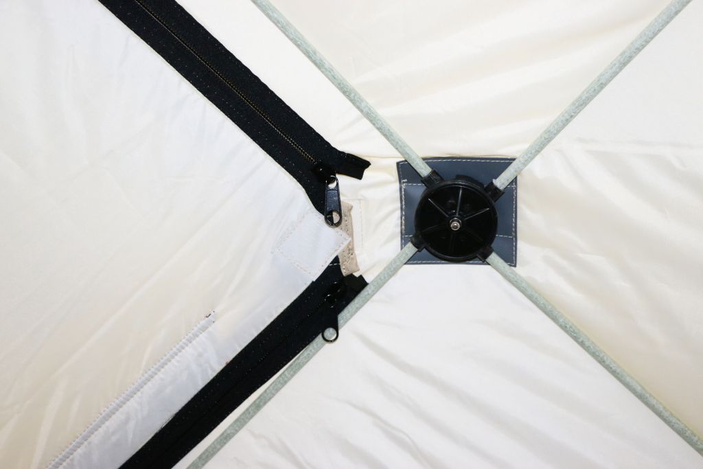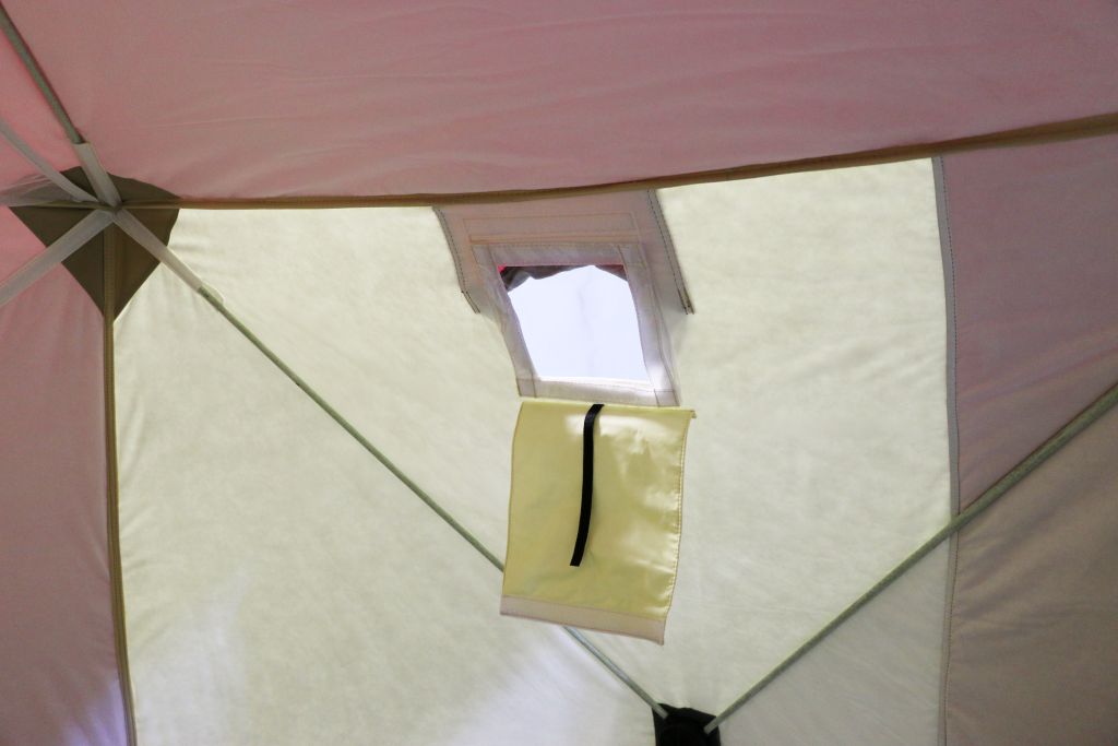 Светлая ткань внутри палатки создает комфортные условия для рыбалки, теперь можно обойтись минимальным освещением. |